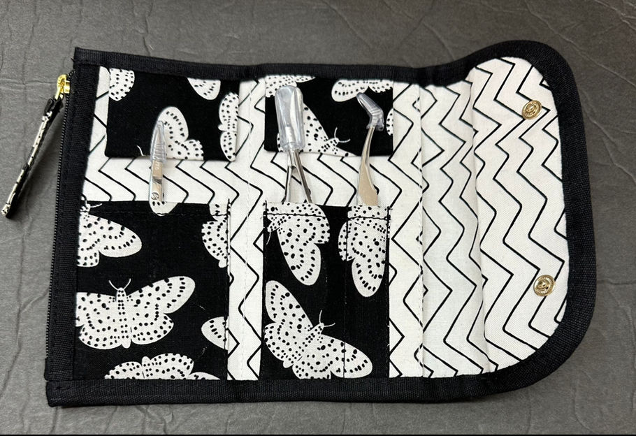 Snapped pouch with a zipper. Comes with scissors, EZsnips, and tweezers.